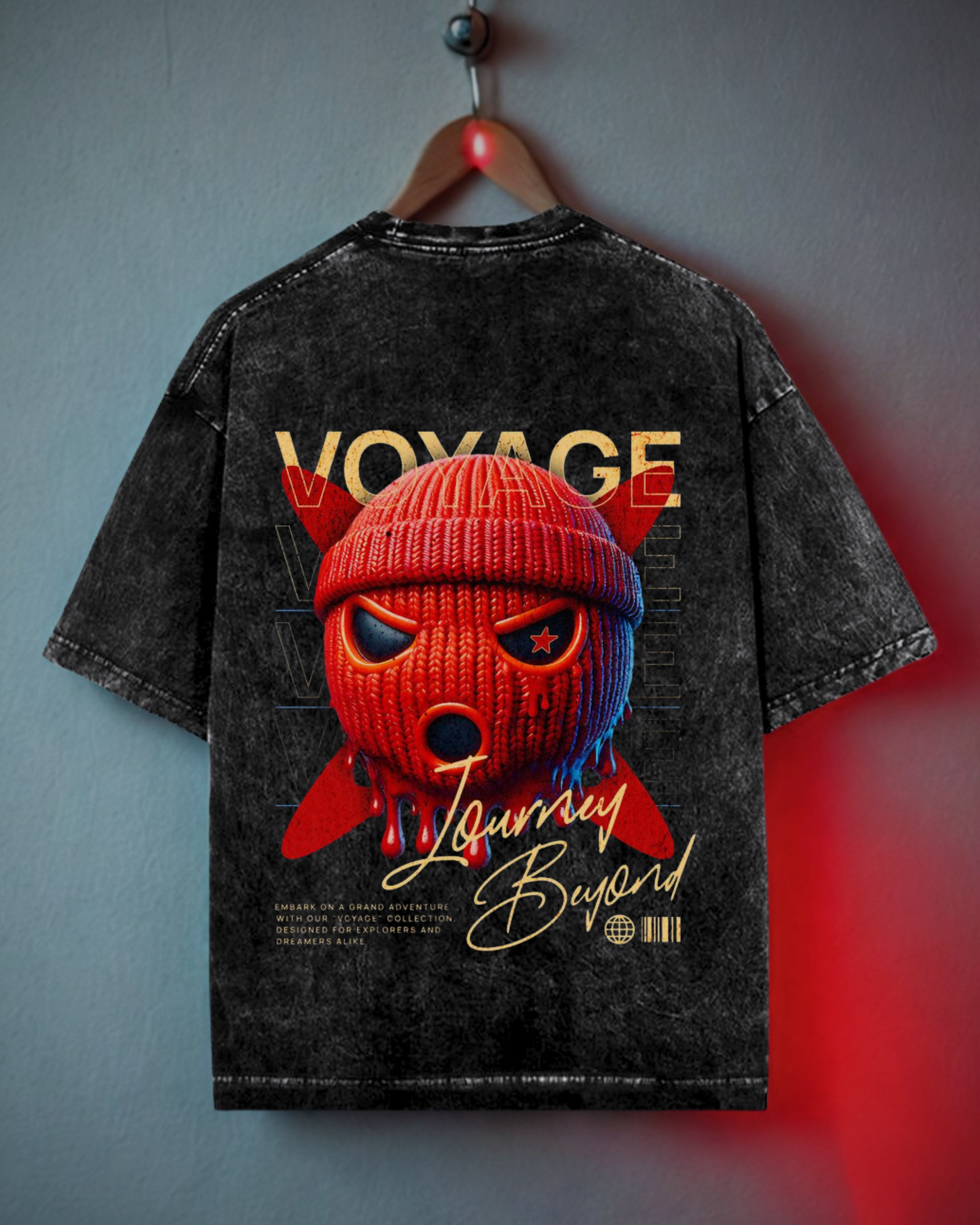 The front stays clean with a symbolic peace insignia built from the word “AURA,” placed like a whispered promise over the heart. Flip to the back, and the war begins — a bold surreal graphic of a red-knitted masked figure, dripping with intensity and layered under the word “VOYAGE.” Below, the haunting phrase “Journey Beyond” dares you to defy your limits.