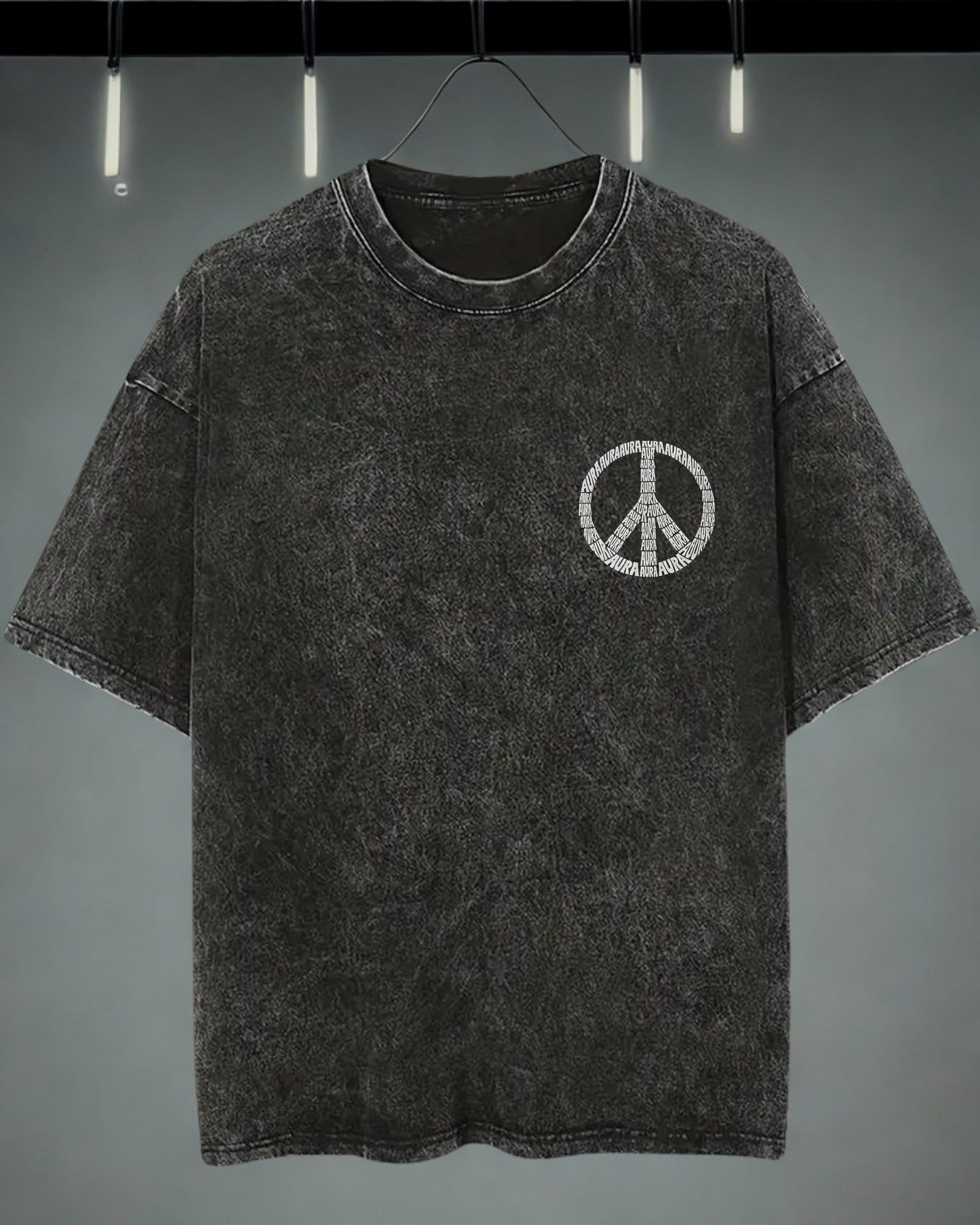 Front: Minimal peace logo | Back: Graphic heavy artwork