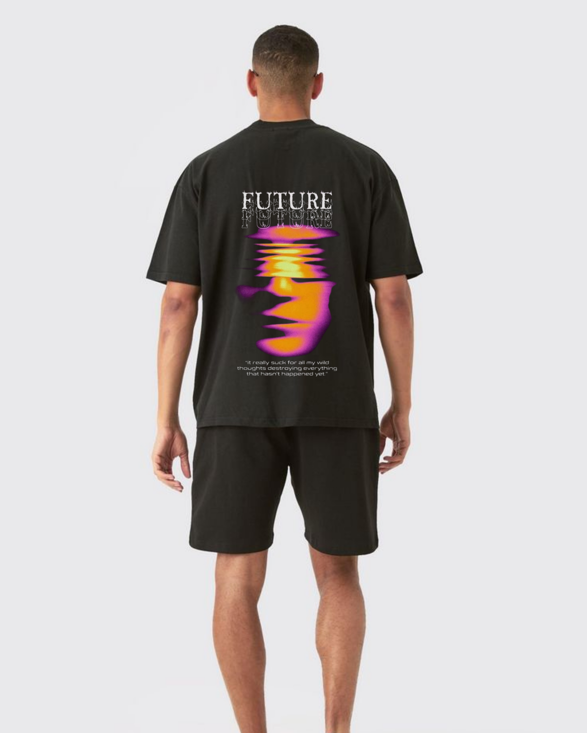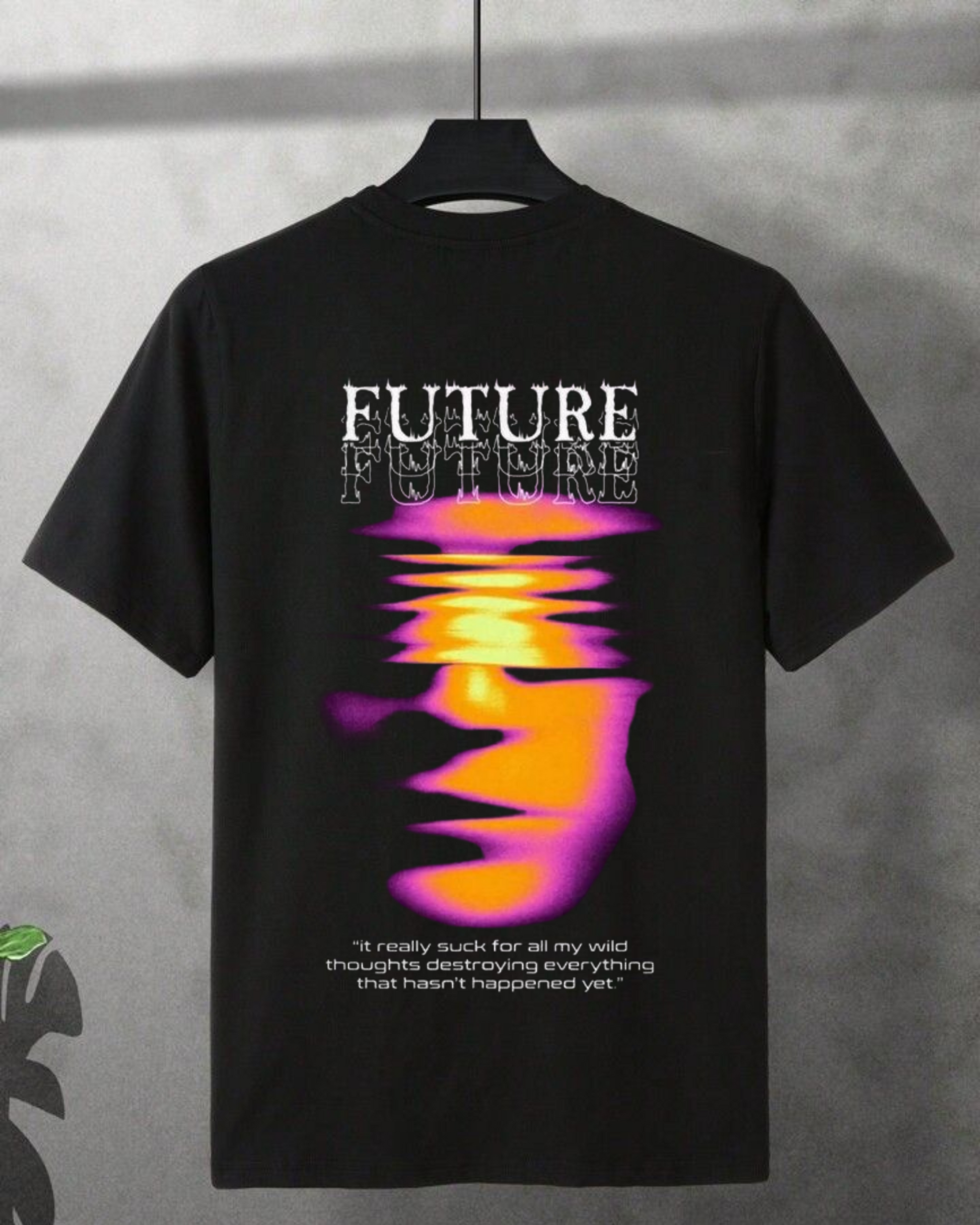 The front keeps it clean with a bold FUTURE logo in warped chrome-gradient text, giving off raw energy and futuristic rebellion. Made from high-quality cotton, this oversized black tee delivers comfort, depth, and edge all in one.