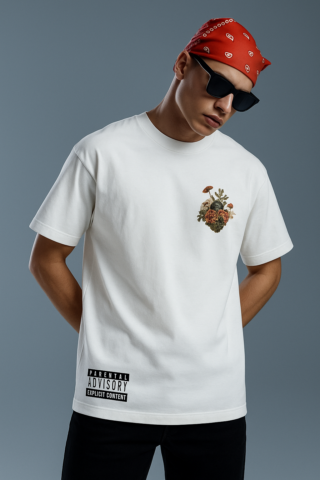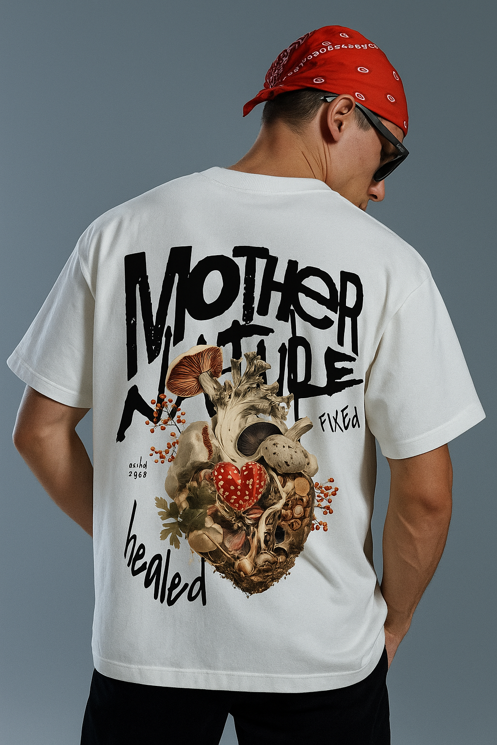 This striking oversized t-shirt features an intricate botanical heart design that celebrates the healing essence of Mother Nature. The artistic composition showcases a beautiful anatomical heart adorned with mushrooms, wildflowers, and natural elements, creating a unique vintage-inspired aesthetic.